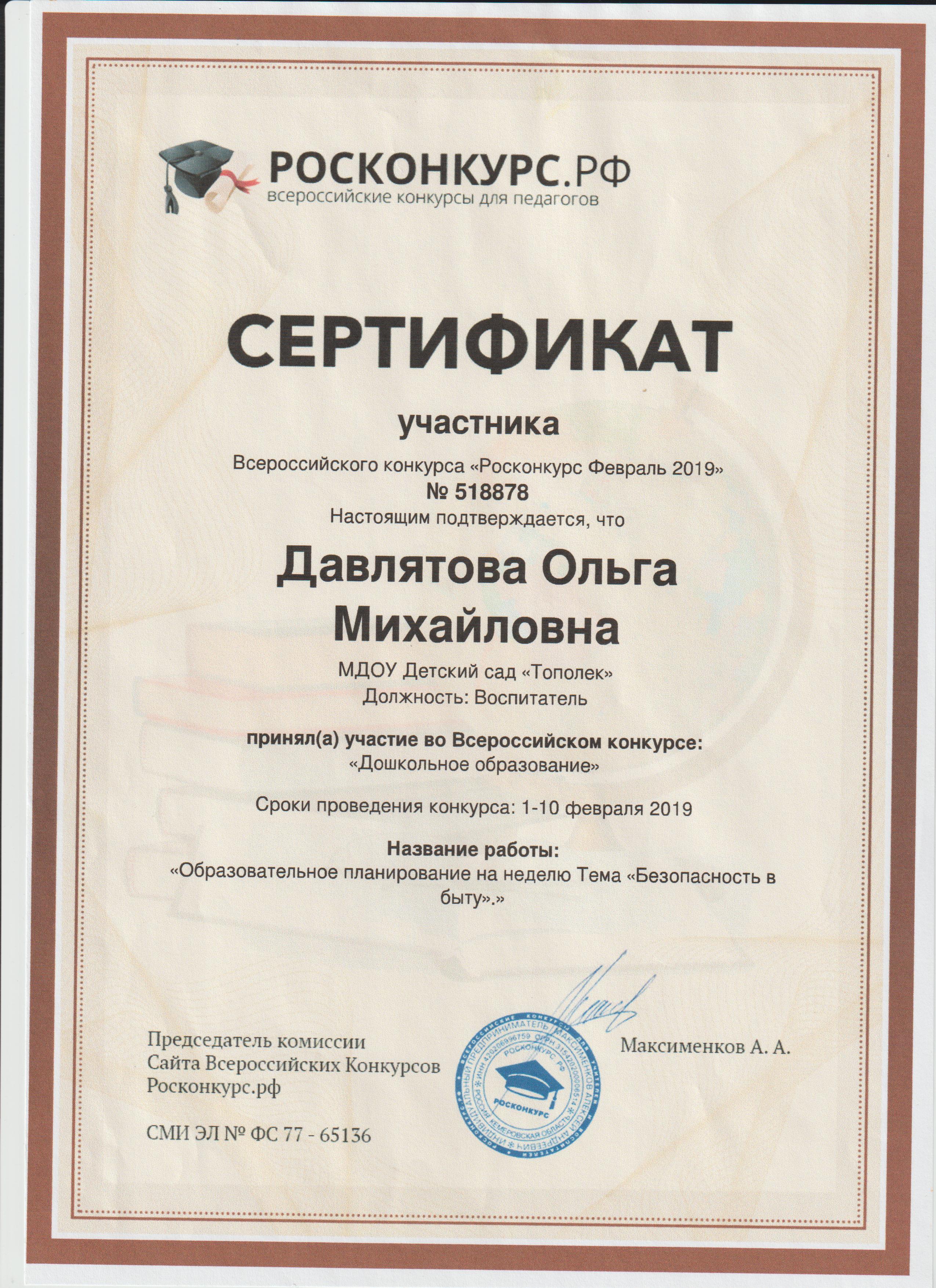 Публикация на сайте Росконкурс.рф, статья "Образовательное планирование на неделю по теме "Безопасность в быту" СВИДЕТЕЛЬСТВО
