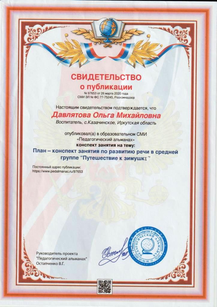 Публикация в сборнике "План-конспект по развитию речи в средней группе "Путешествие к зимушке", 2021г