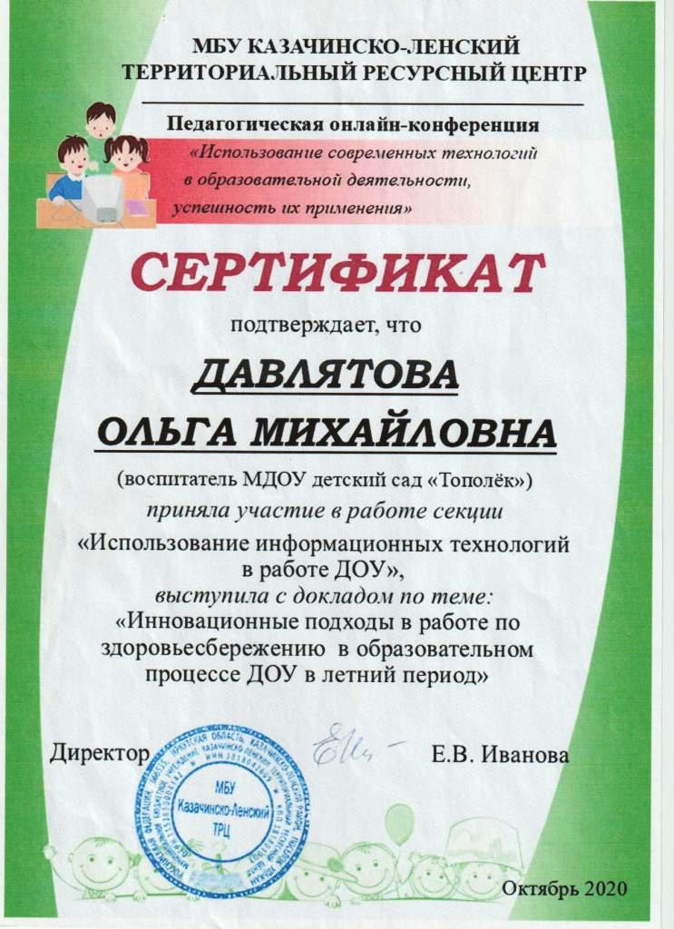 Муниципальная педагогическая онлайн-конференция, доклад на тему "Инновационные подходы в работе по здоровьесбережению в образовательном процессе ДОУ в летний период", 2020г СЕРТИФИКАТ