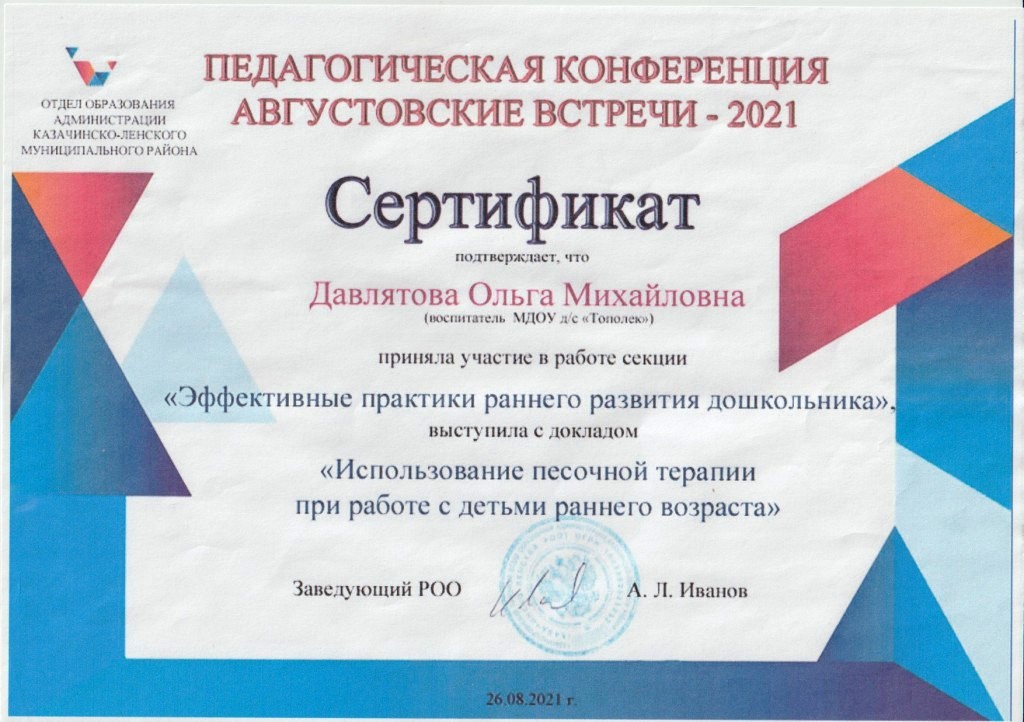 Муниципальная педагогическая конференция, доклад на тему "Использование песочной терапии при работе с детьми раннего возраста", 2021г СЕРТИФИКАТ