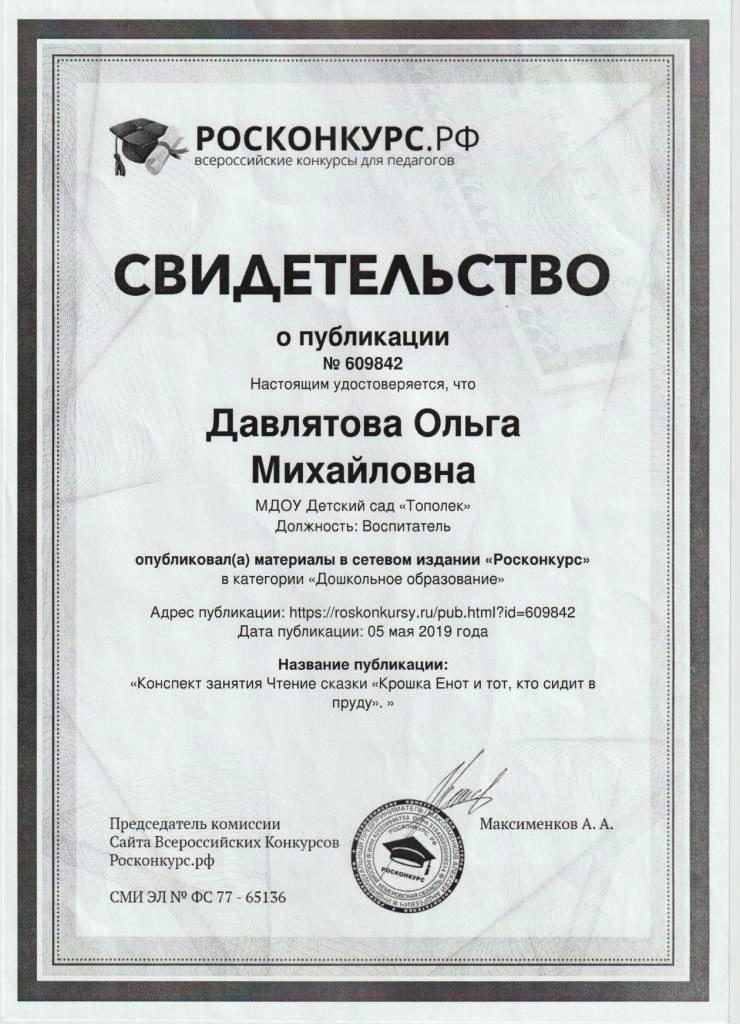 Публикация на сайте Росконкурс.рф, статья "Конспект занятия. Чтение сказки "Крошка енот и тот, кто сидит в пруду" СВИДЕТЕЛЬСТВО