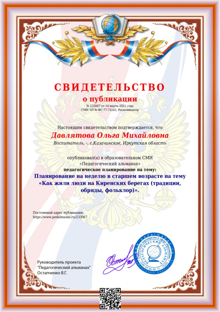 Публикация в сборнике "Педагогический альманах", статья "Планирование на неделю "Как жили люди на Киренских берегах" (старший возраст)", 2021г.