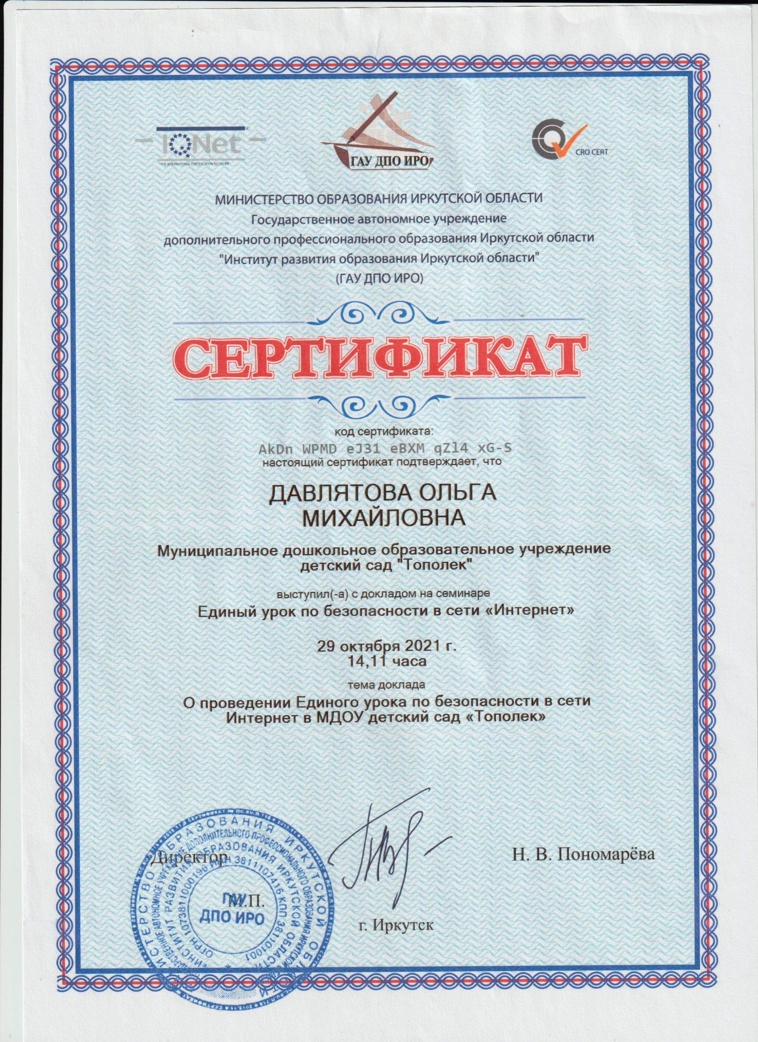 Региональный семинар, тема доклада "Единый урок по безопасности в сети Интернет" (ГАУ ДПО Иркутской области "Институт развития образования Иркутской области"), 2021 г. СЕРТИФИКАТ