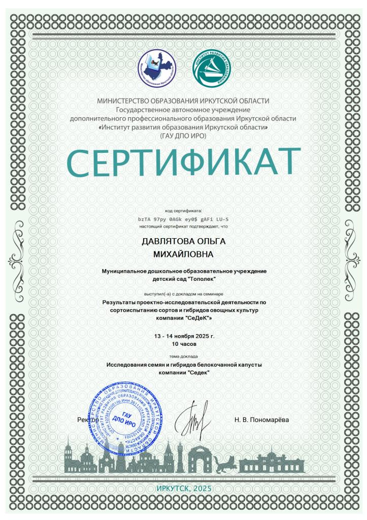 Региональный семинар, тема доклада "Результаты проектно-исследовательской деятельности по сортоиспытанию сортов и гибридов овощных культур компании СеДеК"" (ГАУ ДПО Иркутской области "Институт развития образования Иркутской области"), 2025 г. СЕРТИФИКАТ